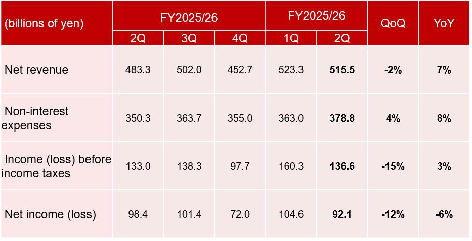 For 2Q, groupwide net revenue came in at Y515.5bn (down 2% QoQ), income before income taxes came to Y136.6bn (down 15%), and net income came to Y92.1bn (down 12%).