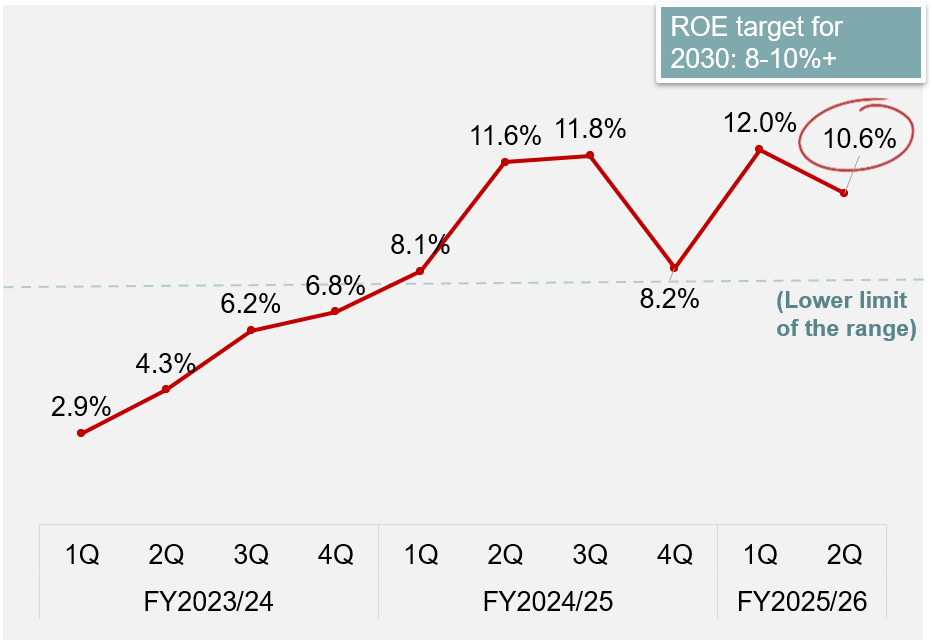 - FY2025/26 2Q: Profits fell QoQ due to gains on sales of real estate in the previous quarter, but ROE reached target of 8-10%+ for sixth consecutive quarter. Income before income taxes of all three international regions was Y44.9bn, marking the ninth consecutive quarter of profitability.