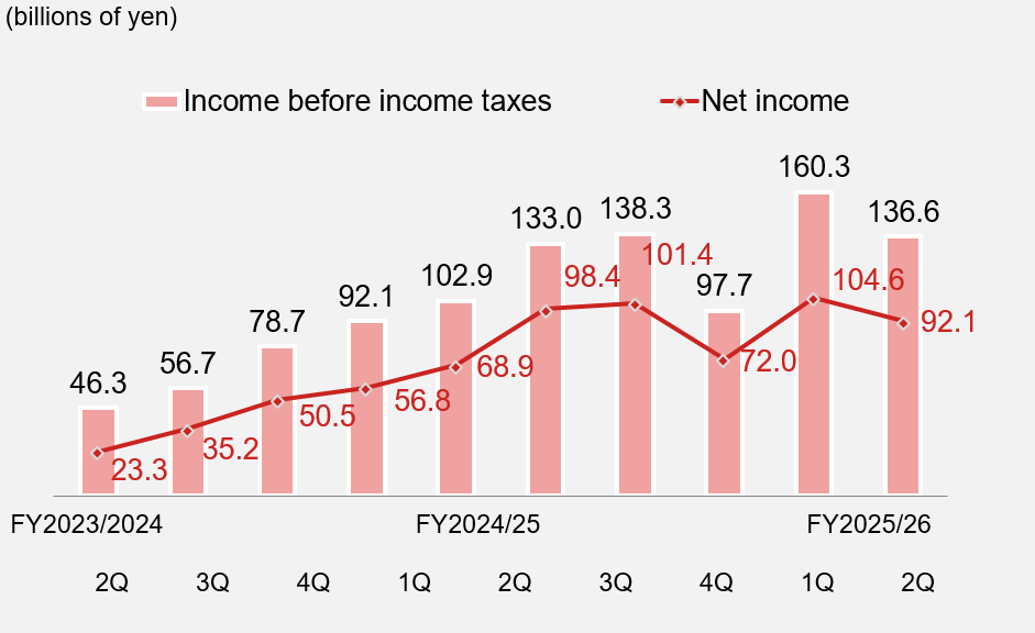 Groupwide net revenue for 1H came to Y1,038.8bn (up 11% YoY), income before income taxes came to Y296.9bn (up 26%), and net income came to Y196.6bn (up 18%).