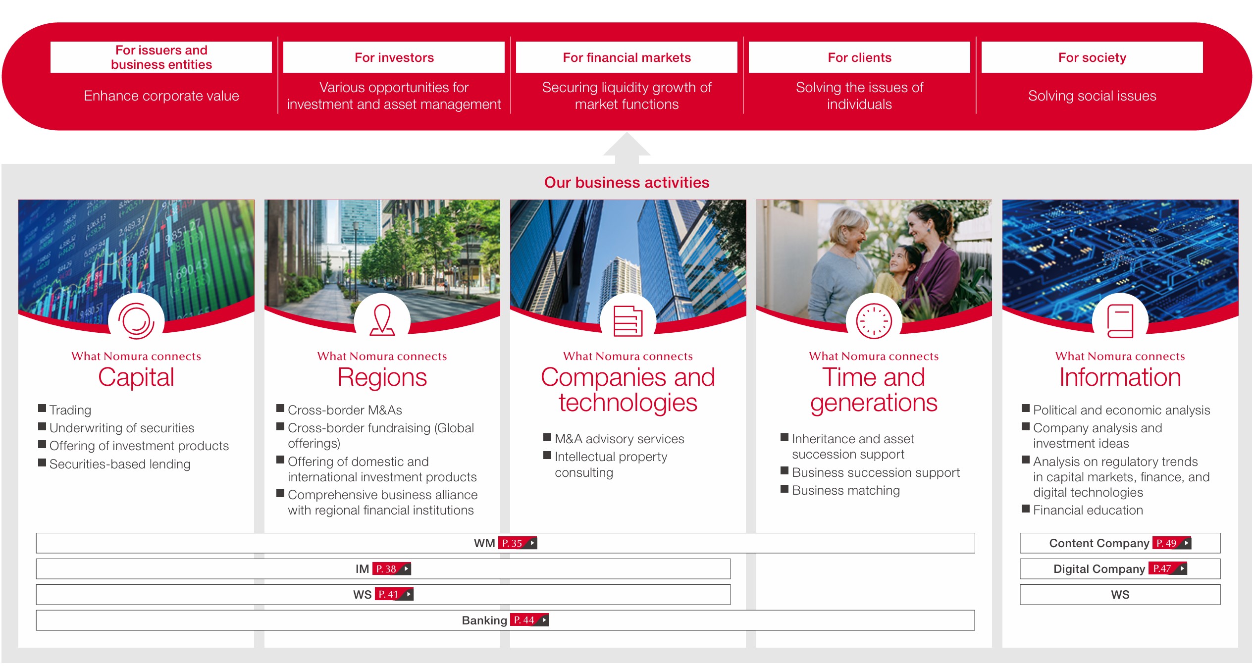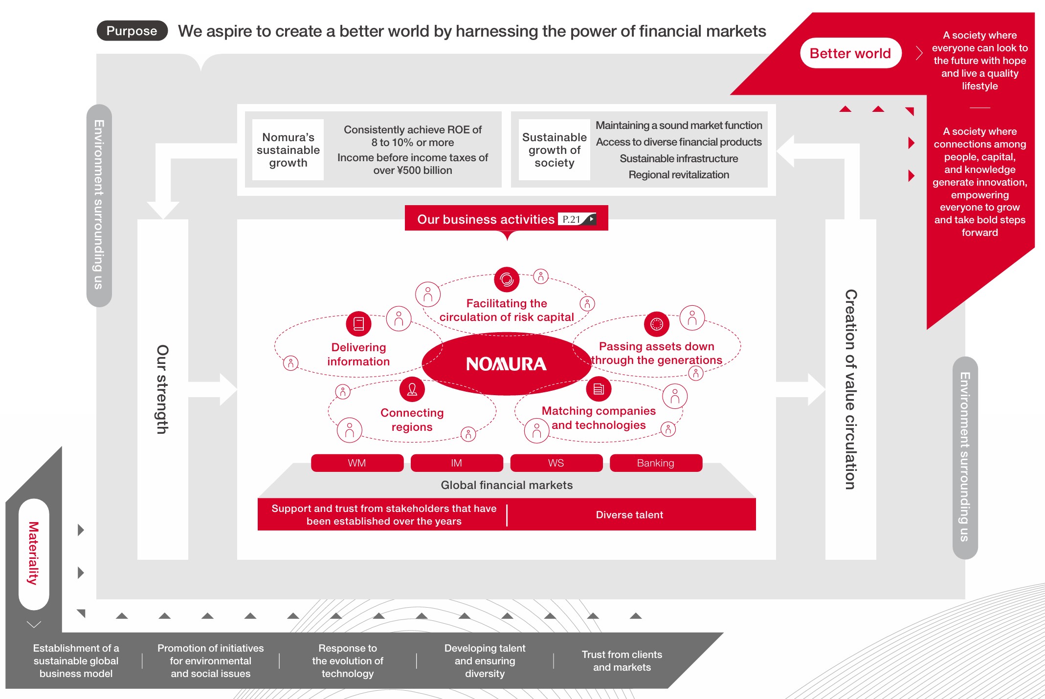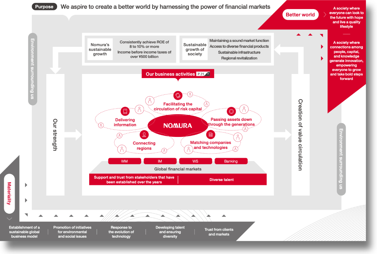 On page 20, we introduce Nomura Group’s value creation process. The diagram shows how we draw on our business strengths to create and circulate value toward our Purpose of creating a better world.