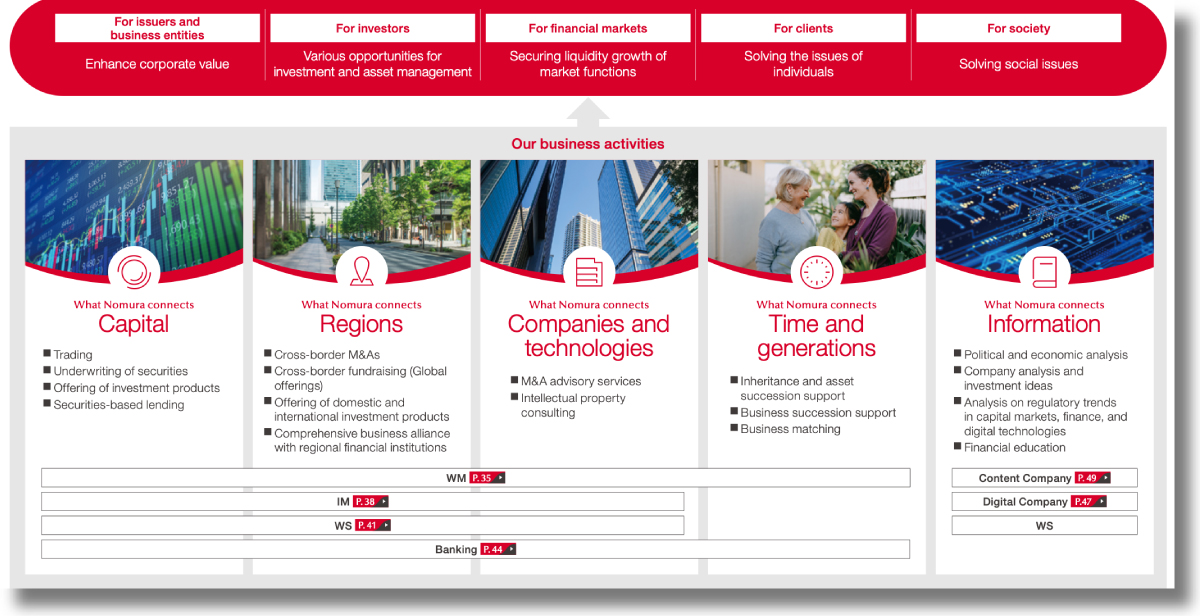 p21: This diagram shows how Nomura’s businesses and strengths connect to value creation, with concrete examples of related activities.