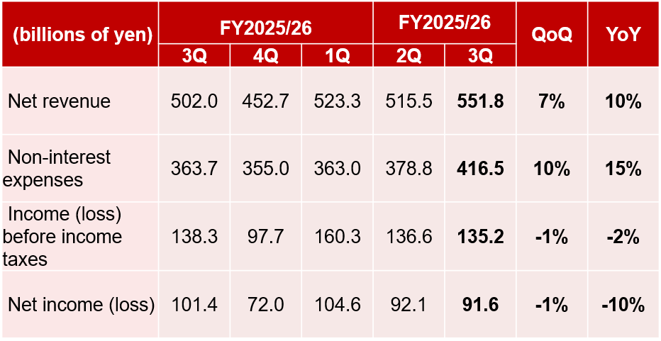 We present here key points from FY2025/26 3Q (1 October 2025 – 31 December 2025) consolidated earnings for Nomura Holdings.