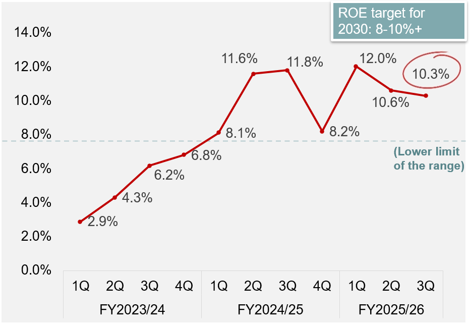 Nomura Holdings’ 2025/26 3Q income before income taxes came to Y135.2bn (down 1% QoQ) and ROE was 10.3%, reaching the quantitative target for 2030 of at least 8 to 10% for the seventh consecutive quarter.