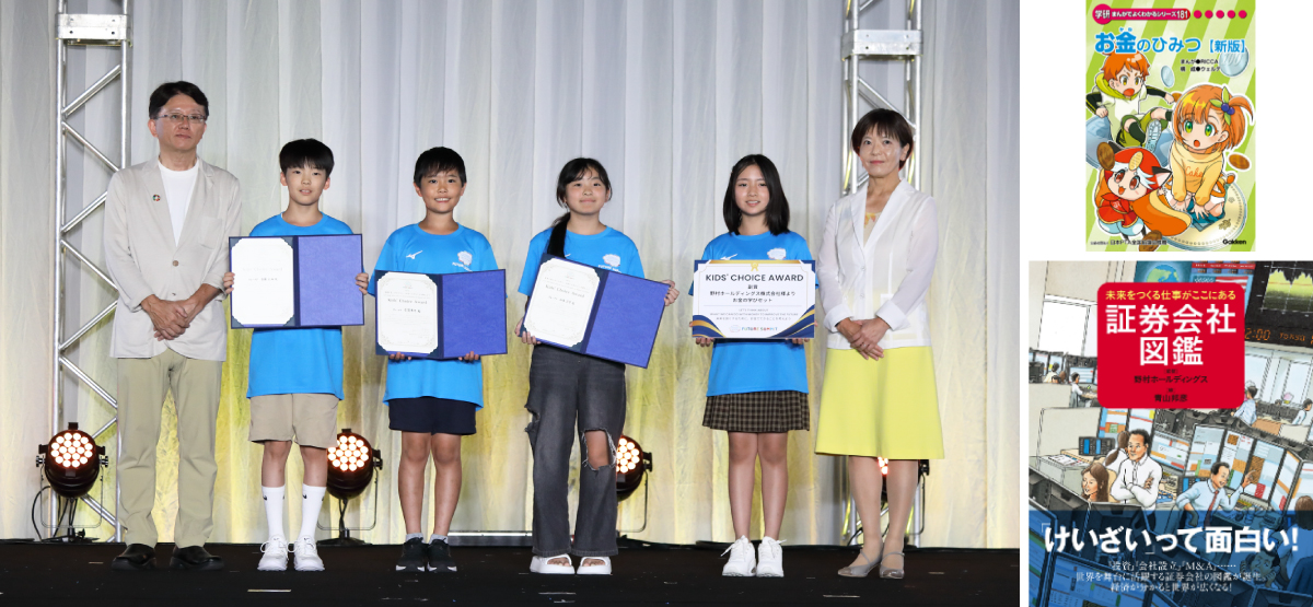 - 最優秀賞の表彰の様子。表彰状と副賞には「お金のひみつ」と「証券会社図鑑」(共に発行協力野村ホールディングス)を贈呈