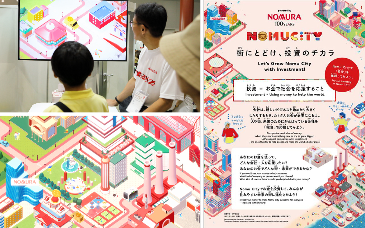 野村グループでは「街にとどけ、投資のチカラ」をテーマに、金融経済教育の体験ブースを出展しました。参加者が手元に仮想のお金を持ち、デジタル上の街「Nomu City」の住民に話を聞きながら、投資したい会社や施設を選択、投資をすることで、デジタルとリアルのハイブリッド体験を通じて「投資のチカラ」を学びます。体験した参加者には、「体験完了証」が記念に渡されました。