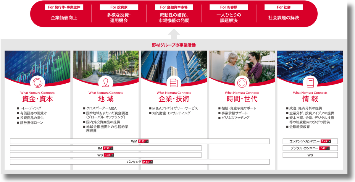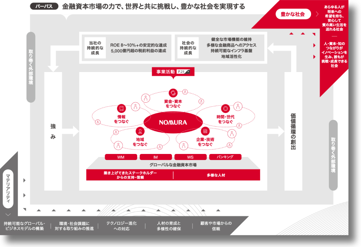 p.20 野村の強みを生かし、資金・資本だけではなく情報や地域などをつなぎ、価値を生み出し、社会と当社の持続的な成長を実現する。この価値創造のプロセス、循環が野村グループの企業活動の基本となっている