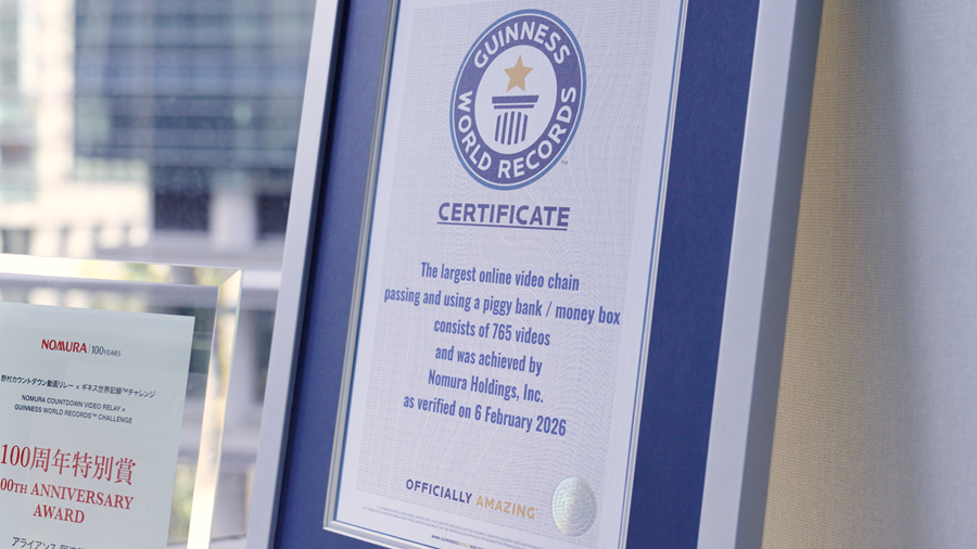 野村グループ創立100周年の取り組みとして、「貯金箱を使って渡していく最大のオンラインビデオチェーン(Largest online video chain passing and using a piggy bank / money box)」に挑戦し、ギネス世界記録™に認定されました。