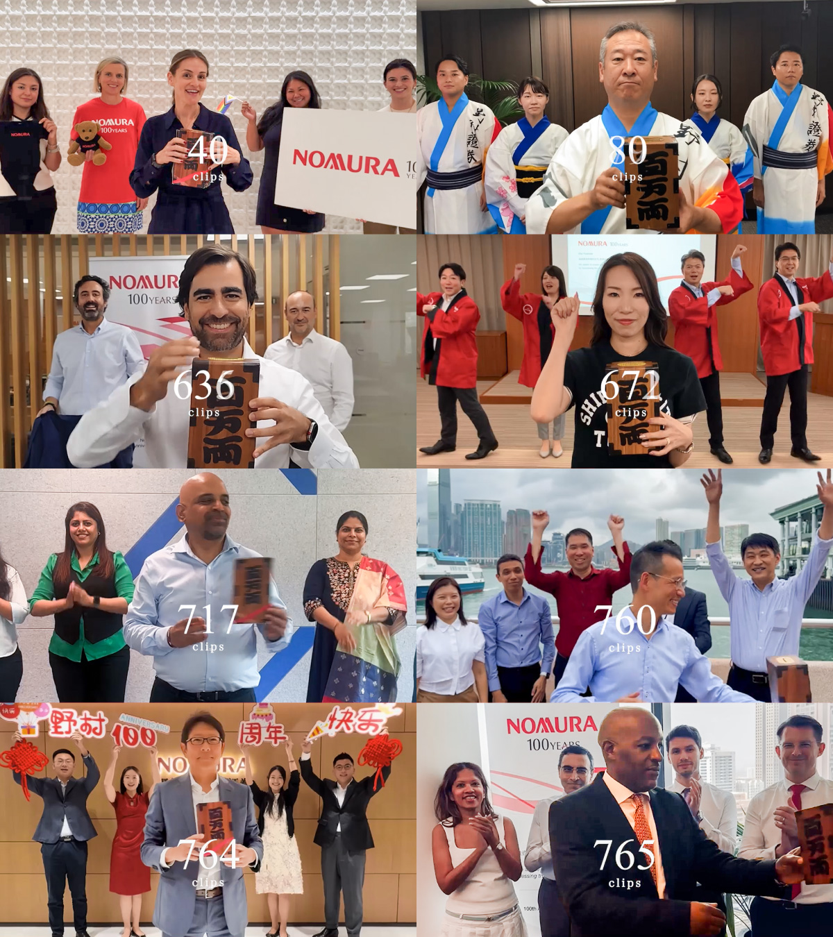 集まった動画は、野村グループ内では創立100周年を迎える100日前から、部署紹介やメッセージを添えて、カウントダウン形式の動画リレーとして公開しました。